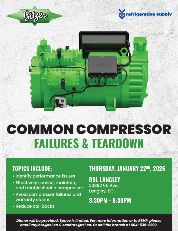 Join us for a Bitzer Compressor Failures & Teardown Training, where we will cover how to identify performance issues, effectively service, maintain, and troubleshoot compressors, avoid failures and warranty claims, and reduce call backs. Dinner will be provided, and space is limited. We can’t wait to see you there.