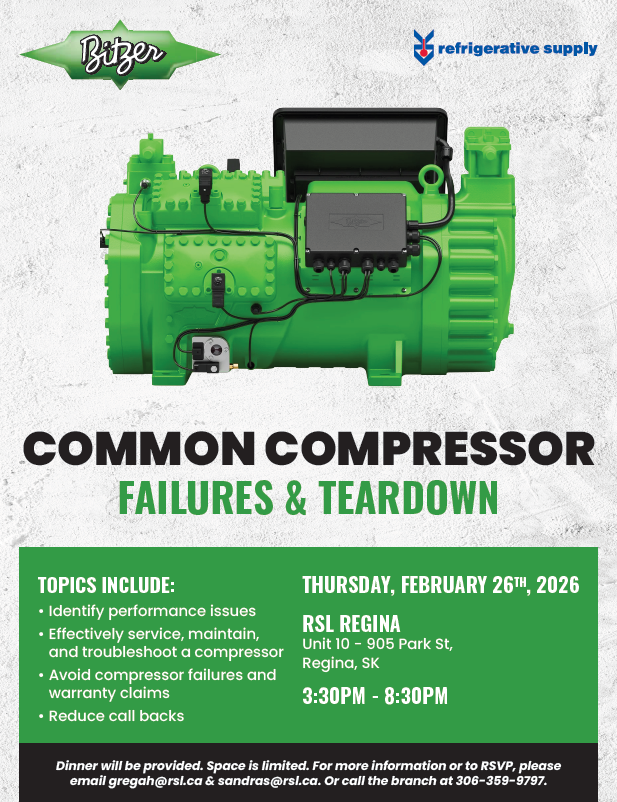 Join us for a Bitzer Compressor Failures & Teardown Training, where we will cover how to identify performance issues, effectively service, maintain, and troubleshoot compressors, avoid failures and warranty claims, and reduce call backs. Dinner will be provided, and space is limited. We can’t wait to see you there.