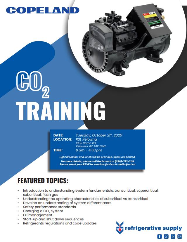 Join us for an engaging Copeland CO₂ Training where you'll gain a comprehensive understanding of system fundamentals including transcritical, supercritical, subcritical, and flash gas processes, explore the operating characteristics of subcritical versus transcritical systems, and learn to identify key system differentiators. The session will also cover safety performance standards, proper charging techniques for CO₂ systems, oil management practices, and detailed start-up and shut down sequences, along with the latest updates on refrigerant regulations and codes. Light breakfast and lunch will be provided, and spots are limited.